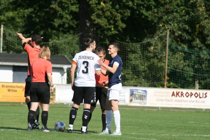Nach dem Seitenwechsel explodierte unsere Nummer 99 Fabian Gehrt förmlich und drehte mit einem sehenswerten Doppelpack das Spiel innerhalb weniger Minuten. Spätestens jetzt hätte unsere Erste das Match komplett kippen müssen. Doch eine hitzige Rudelbildung brachte Unruhe ins Spiel – zwei Zehdenicker mussten mit rot vom Platz, auch der Trainerstab wurde auf die Tribüne geschickt.